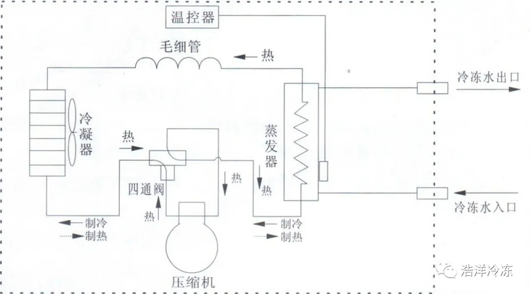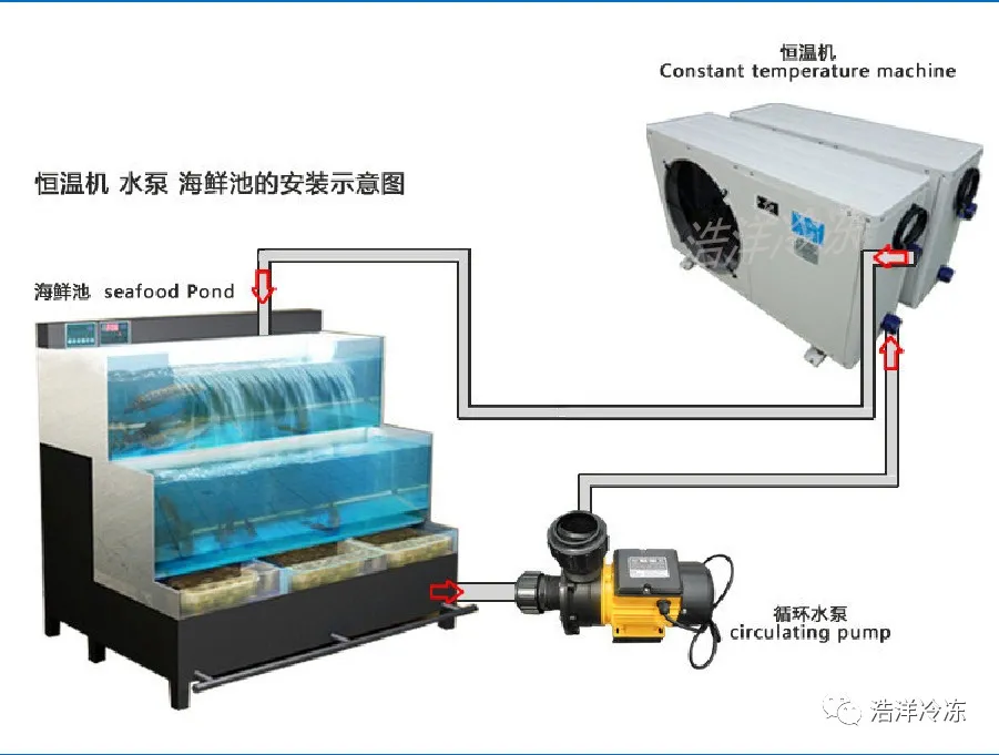 海鲜机用于海鲜养殖等温度控制系统,原理和空调类似。主要部件为钛桶(又名钛炮),风机,冷凝器,压缩机,温控器,四通阀等部件。
